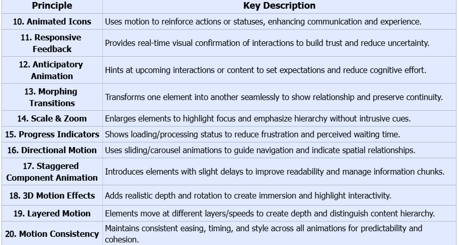 Here is a table of the 20 motion design principles with examples for you to quickly understand the key features of that: