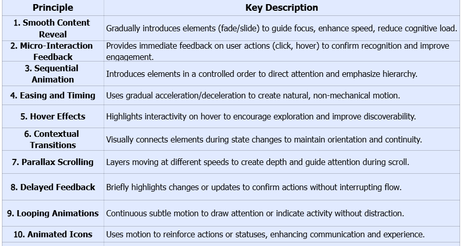 • Limiting animations to areas that enhance comprehension or delight, rather than decorating every element