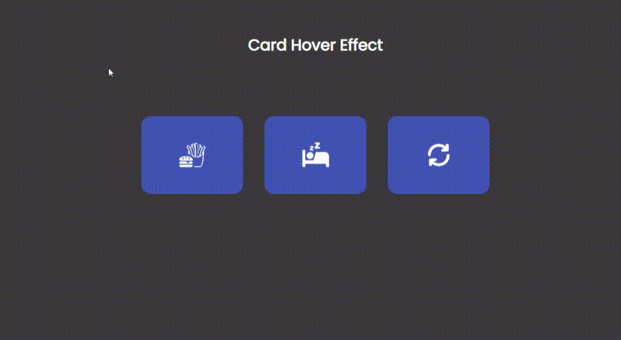 In this card hover effect, when the mouse hovers over each card with an icon, the content text corresponding to that icon appears. For instance, when hovering over the card with a hamburger icon, the card triggers an animation and displays the text "eat".