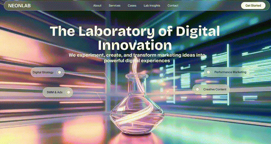 For example, the hero section on NEONLAB's homepage uses parallax effects on the electronic background, foreground laboratory beakers, and text layers. This not only gives the page an immersive and 3D stereoscopic effect, but also subtly guides users' attention to the core homepage text that conveys product value.