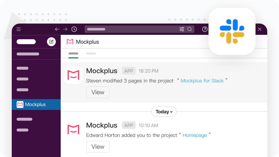 Learn moreMockplus for Slack brings Slack into your design workflow, always keeping your entire team in sync, even when messaging in Slack. Simply install this integration app and connect it to your Mockplus account. You'll then get notified whenever there is any change in your Mockplus design team.